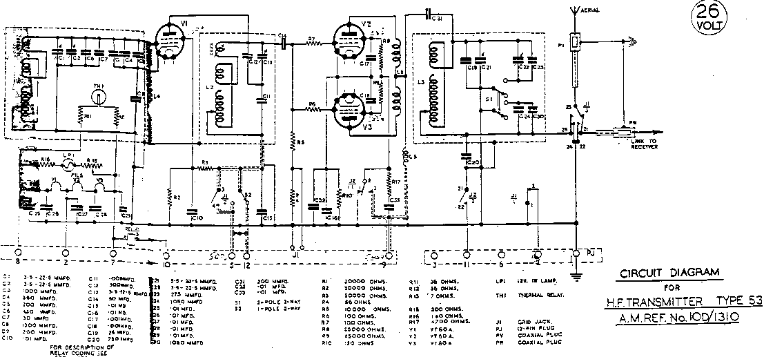 There are three tuned circuits. The first is the frequency determining circuit covering 1.2 - 3.25 MHz, the second the oscillator output circuit covering 2.4 - 6.5 MHz, and the third the amplifier output circuit covering 2.4 - 6.5 MHz and 4.8 - 13.0 mHz. Band switching is confined to the output circuit.