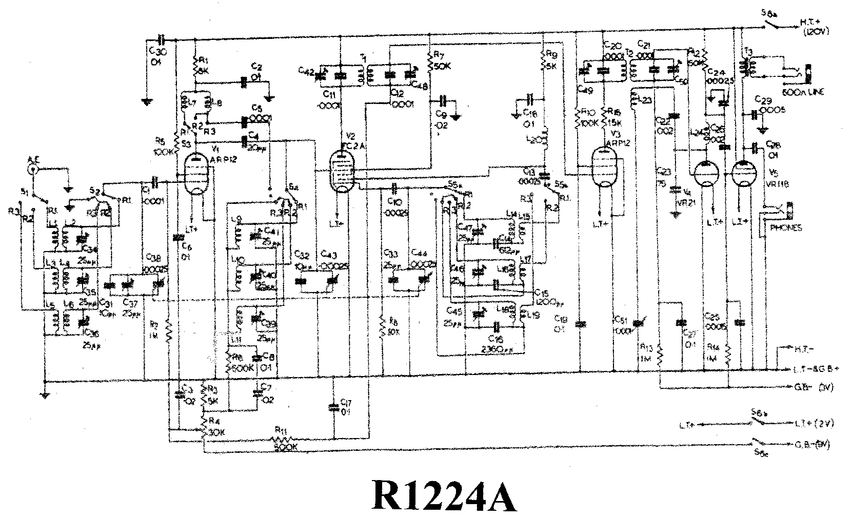 Audio output is provided for high impedance headphones via a capacitor on the primary of the output transformer. The 600 ohm secondary winding is available for line output, but was probably utilized for American low impedance 300 ohm headphones.