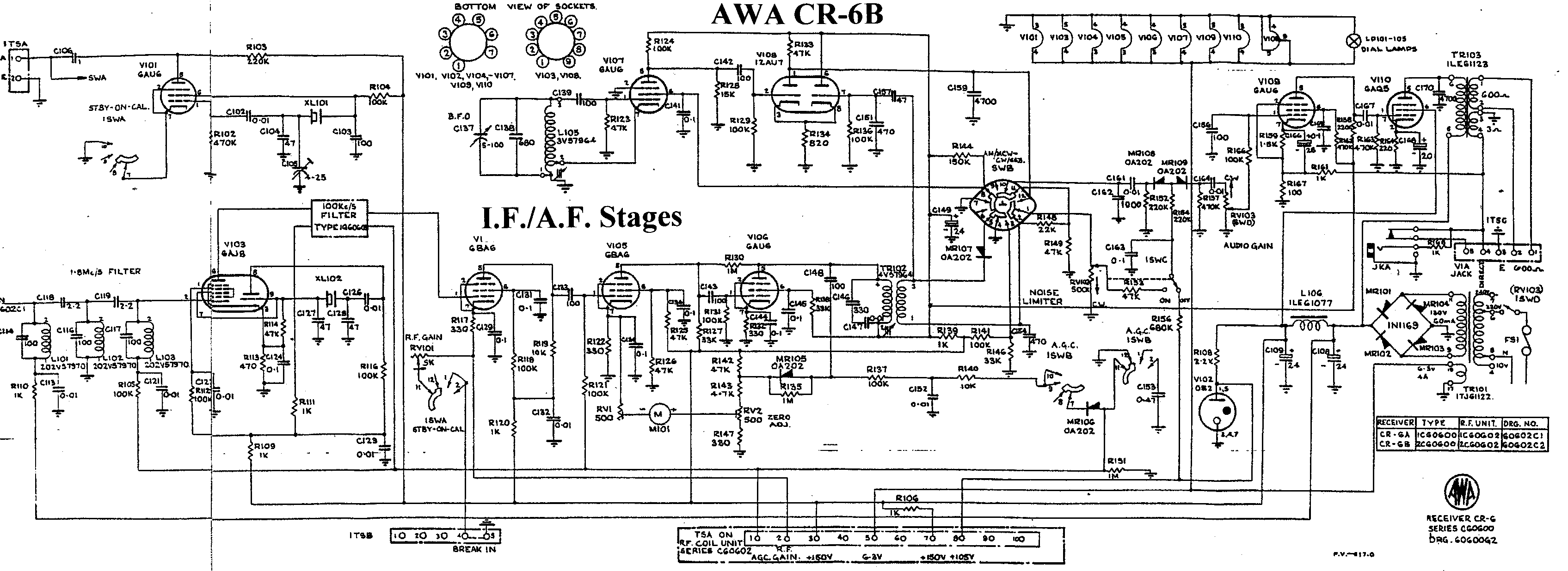 The power supply consists of a full wave bridge providing 150vdc for HT and 6.3v for heaters. A VR tube (OB2) provides power for the noise limiter and variable oscillator.