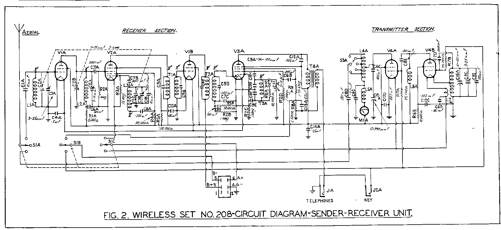 Power Supply: The set was supplied with a separate battery box, comprising a l.5v heater (L.T.) supply and a 90 -105v battery block for H.T. supply. The L.T. current on sending is 200ma with key down and 250ma on receive. H.T. drain is l8ma on transmit and 8.5ma on receive.